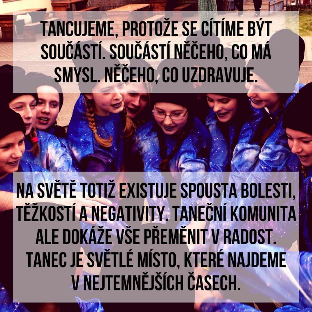 Tancujeme, protože se cítíme být součástí. Součástí něčeho, co má smysl. Něčeho, co uzdravuje. Na světě totiž existuje spousta bolesti, těžkostí a negativity. Taneční komunita ale dokáže vše přeměnit v radost. Tanec je světlé místo, které najdeme v nejtemnějších časech.